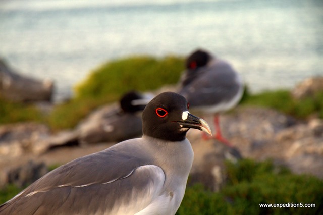 Nous voyons aussi des mouettes à queues fourchues, une espèce aux grands yeux cerclés de rouge qui ne vit qu’aux îles Galápagos.