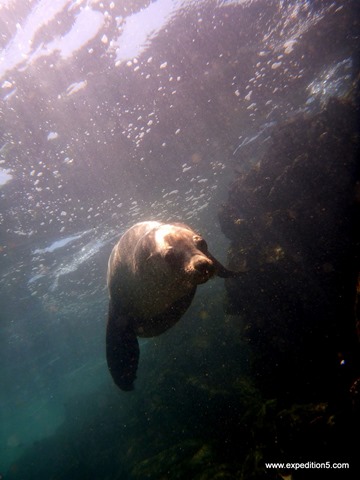 Mais le meilleur est encore à venir : je vois bien que les lions de mer ont envie de jouer, je virevolte donc un peu sous l’eau, et ils arrivent. Ca tournoie dans tous les sens, ils me frôlent, nagent autour de moi, et quand je fais mine d’aller reprendre mon souffle, ils viennent mordiller gentiment mes palmes du bout des dents pour m’inciter à venir encore jouer avec eux… Mémorable !!!