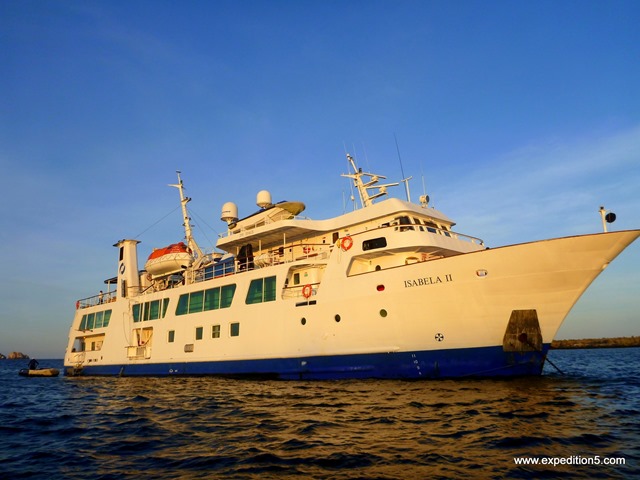 Pour tout dire, nous n’avions pas prévu d’aller aux îles Galapagos. Ou en fait, plutôt si : c’est même la raison pour laquelle nous avons “court-circuité” l’Alaska. Beaucoup de kilométrage et un environnement semblable au Nord canadien, nous avions décidé de garder notre budget pour visiter les Galápagos. Mais face aux prix, c’est la déprime ! Les visites dans les îles sont très dispendieuses : il y a tout d’abord le billet d’avion à payer (500 $ depuis Quito, la capitale de l’Équateur), l’entrée du parc (100 $, ouch ! eh oui, l’ensemble des îles se trouve dans un parc naturel, et l’Équateur sait faire payer les touristes pour contrôler l’afflux de visiteurs), et bien sur les visites en elles-mêmes, qui se font le plus souvent sous forme d’une croisière qui vous mène d’une île à l’autre. Et c’est là où ça fait mal : nous nous renseignons dans une ou deux agences, et les prix des croisières varient de 1500 $ à 2500 $. Ajoutez-y le prix de l’avion, l’entrée du parc, puis multipliez le tout par 5 personnes : aie aie aie ! Vu la dépense, nous choisissons de nous rabattre vers une visite ailleurs, moins chère, un tour en Amazonie ; c’est dommage les Galápagos nous tentaient vraiment, mais le prix est vraiment trop cher. Et donc revisite des agences pour chercher une expédition en Amazonie, et ce qui devait arriver arriva : vous le savez bien, c’est quand on arrête de chercher qu’on trouve. Un bateau de croisière qui vend ses dernières places pour les Galápagos à prix bradé, à la dernière minute : 1300 $ par personne, avec le vol comprit. Bon, ça fait quand même une grosse somme pour 5, une très grosse somme, qui nous permettrait par ailleurs de vivre plusieurs mois en voyage en Amérique du Sud – mais quand même … Les Galápagos nous attirent irrésistiblement… La femme de l’agence de voyages finit de nous convaincre en nous montrant le bateau : un vrai mini-paquebot de luxe (moins de 40 personnes et 53 mètres), avec le jacuzzi sur le pont… Les enfants s’excitent, les parents aussi : Ok, on prend ! Normalement nous dit-elle, c’est un package qui se vend dans les $3500 par personne. Vérité ou simple boniment de vendeur, ça fait quand même une grosse réduction ; et puis, même si le prix total est élevé, on n’a pas sacrifié l’Alaska pour rien non ?