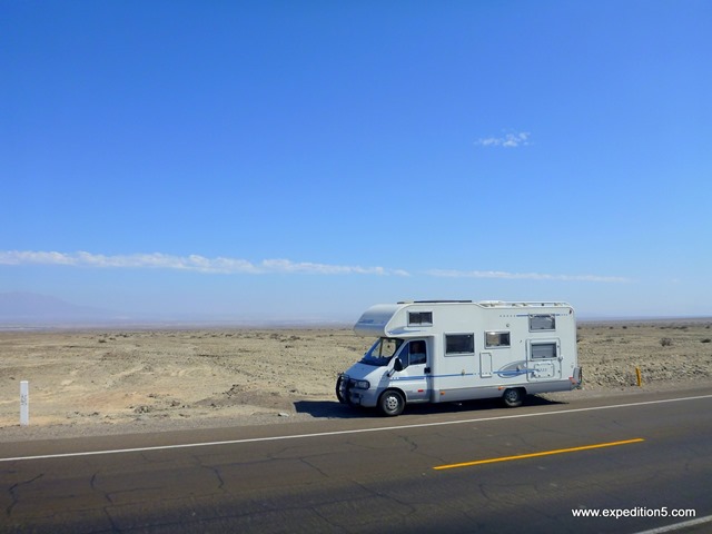 Nous reprenons la panaméricaine vers le sud. C’est une bonne route qui ne traverse que du désert, tantôt de sable avec des millions de petites dunes, tantôt de roches. Mais rien n’y pousse et parfois nous apercevons un village ou une petite ville, là où notre GPS nous présente une rivière. L'humain ne peut vivre que proche de l'eau douce ! Cependant nous traversons les ponts sans jamais voir une seule goutte d’eau. Mais comment font tous ces gens pour pouvoir vivre dans un milieu si hostile ? Notre petit bonhomme de chemin nous emmène au RV parc de Huanchaco. Nous sommes super étonnés de voir sur un gros panneau devant la porte l’inscription : « camping-car ». Nous y rencontrons une famille française du nom de « Passifous ». En effet, entre voyageurs nous nous appelons par notre nom de blog. Les autres nous appellent donc les « expédition5 ». Avec les Passifous nous nous étions déjà contactés par email alors nous sommes tout contents de nous connaitre en chair et en os. Nous restons quatre jours et la veille de notre départ, nous sommes heureux de voir arriver nos autres amis allemands Lucas et Éva.