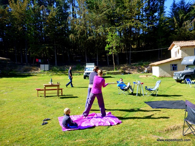 C’est après 10 heures de route que nous dans le camping de Cusco. Ouah, la surprise ! Une douzaine d’équipages comme nous, venus de tous horizons et avec toutes sortes de véhicules sont là. Nous sommes encore plus surpris quand des inconnus nous abordent par nos prénoms. Mais c’est que nous sommes attendus ! Ça fait chaud au cœur. Nous faisons donc connaissance avec Valy et Bruno, des Français de l’île de St Martin et une charmante famille québécoise Mathieu,Pascale,Christophe et Philippe. Nous comprenons que c’est nos amis Françoise et Jacky qui sont venus avant nous dans ce camping, ainsi que la famille des Passifous qui leur avait envoyé un message annonçant notre venue. Ils avaient déjà tous voyagés ensemble en Amérique Centrale. Les garçons sont super contents, enfin des amis qui parlent français ! Durant les deux grosses semaines que nous passons ensemble, les gars s’entendent très bien et ont les mêmes centres d’intérêt. Très vite nous prenons nos marques et nous profitons d’être dans cette grande famille de voyageurs. Nous échangeons énormément d’infos entre ceux qui vont vers le sud et ceux qui vont vers le nord. Nous faisons de beaux feux de camp et barbecues le soir pendant lesquels nous partageons nourriture et expériences (et bières !). Chacun met la main à la pate ce qui donne de superbes soirées.
