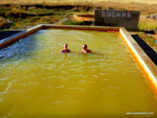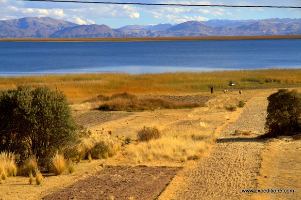 Nous reprenons enfin les routes direction le mythique lac Titicaca. Un bivouac d’un soir nous amène à nous baigner dans des thermes aux eaux un peu jaune-brun mais comme rien ne nous arrête, nous nous y plongeons les 5. La traversée de l’altiplano (immense plateau à environ 4000 mètres d’altitude) nous éblouit. On fait sans cesse des arrêts photo et souvenirs. Et ca y est, nous avons les fameux bonnets des Andes, et en alpagas rien que ça ! Mathéo ne veut plus s’en séparer et dort avec ! Ha, les ados, pas de demi-mesures.