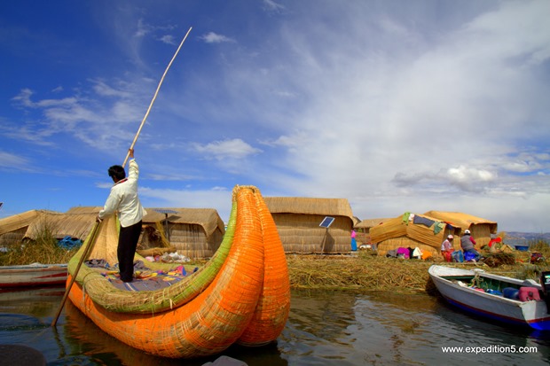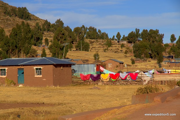 Nous arrivons à Llachon, petit village pittoresque du bord du lac Titicaca. Ce n’est quand même pas le coin le plus touristique, car on doit faire 13 km de piste pour y arriver. Nous sommes enchantés par le point de vue et par l’accueil des villageois. C’est sûr qu’avec notre petite tête blonde de Clément, nous ne passons jamais inaperçus. Nous passons même, lui et moi une petite matinée à l’école du village dans l’unique classe des 3-5 ans. Nous trouvons à nous garer dans l’entrée d’un tout petit restaurant tenu par Mariza et sa mama qui prennent soin de nous pendant ces 3 jours. Elles nous organisent même un tour en bateau pour aller visiter une île flottante. Il en existe environ 130 sur ce grand lac, elles sont habitées en moyenne par une dizaine de familles et ont une superficie moyenne de 700 mètres carrés. Nous avons été reçus par le chef d’une des îles qui nous a expliqué la fabrication de l’île et leur vie dessus. C’est un amoncellement entrecroisé de roseaux qui permet à l’île de flotter. Les habitants y vivent très simplement sans électricité, à peine un petit panneau solaire pour toute l’île. Ils pêchent, chassent et tissent. Une fois par semaine, ils vont au marché local échanger leurs butins contre des pommes de terre, des cordes …etc. Ils déplacent plusieurs fois par an leur île en fonction de la hauteur d’eau donc de l’abondance du poisson. Avant de rentrer, le chef nous emmène faire un tour sur une barque en osier, sa Mercedes comme il l’appelle. Nos trois jours à Llachon sont très relaxants et en dehors du temps.